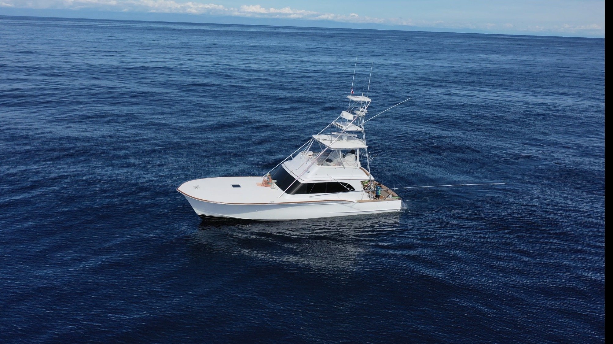 Step inside to discover a beautifully appointed air conditioned. The cabin features rich wood finishes, plush seating, and large windows that flood the space with natural light. The salon is a perfect place to cool off between fighting fish on a hot, Costa Rican day.